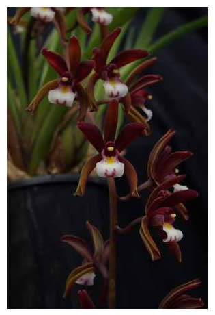 This is another thick leafed species with dark flowers. Its flower scape is pendulous and 28-75cm long with between 7 and 33 flowers. The flowers are strongly coconut scented and 3.5-4.5cm with sepals deep maroon to dull yellow green with strong maroon staining.